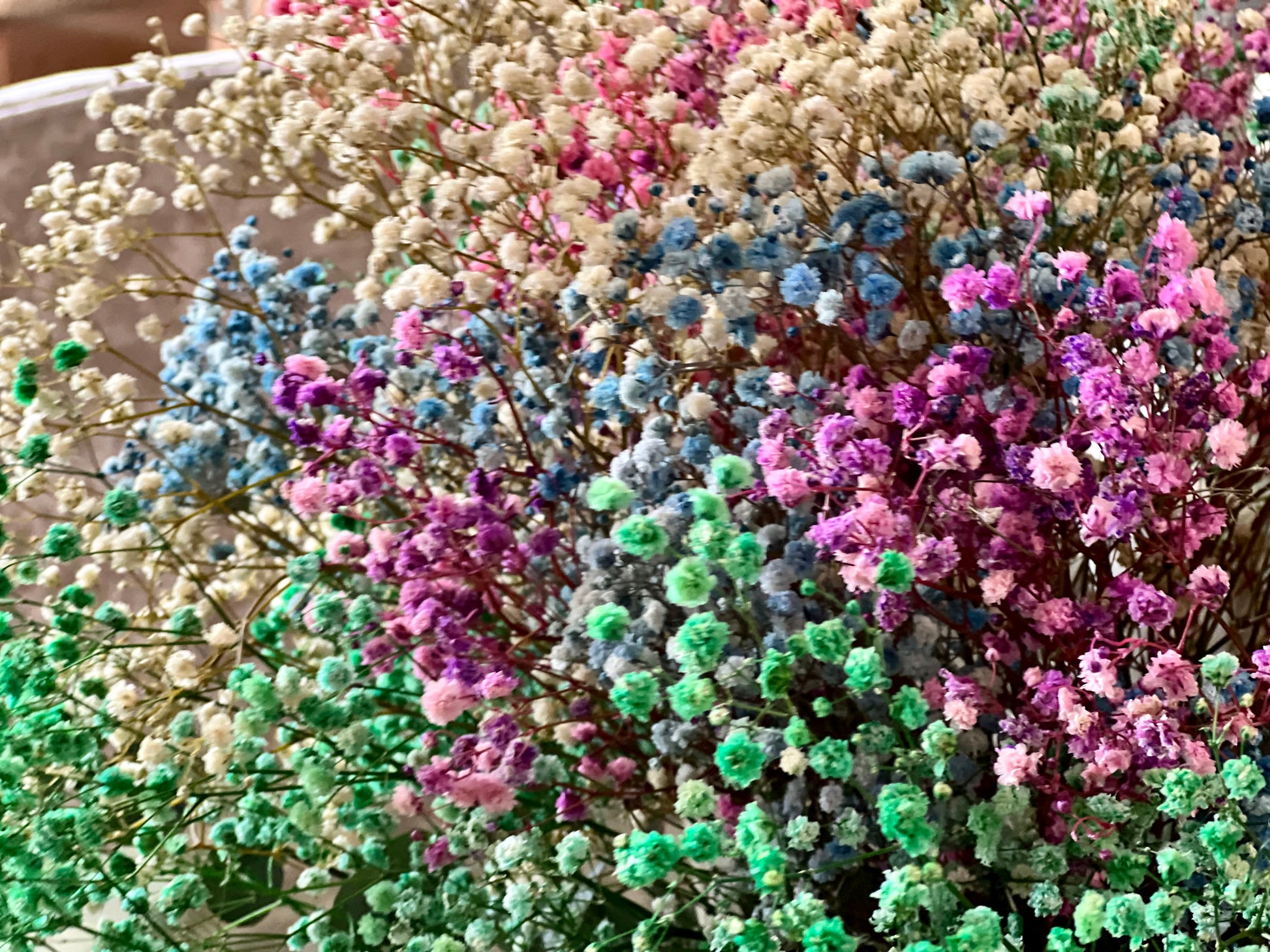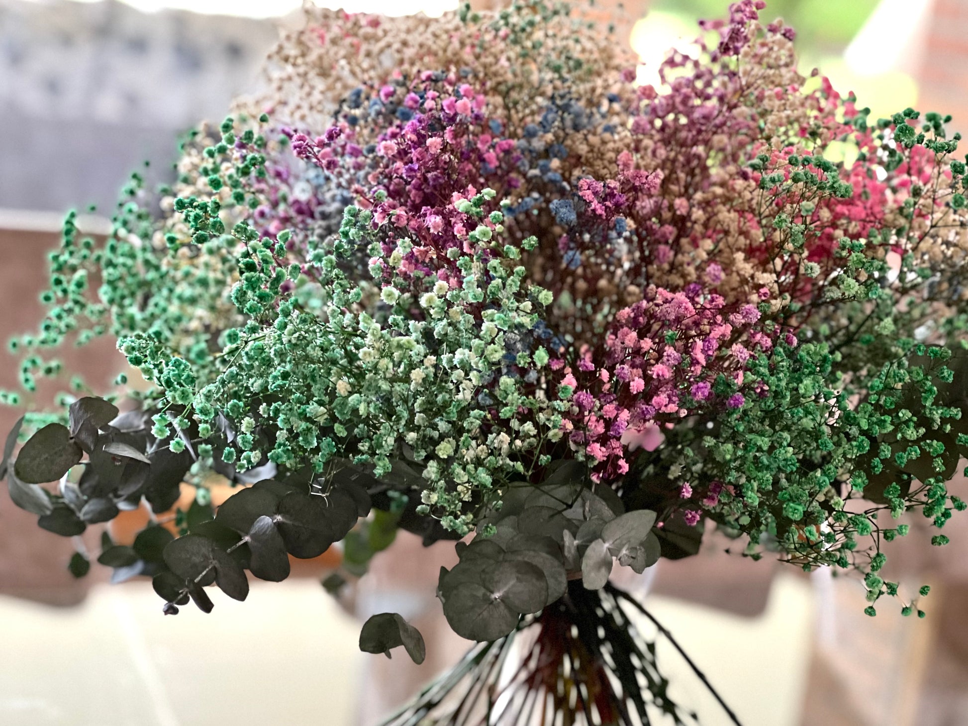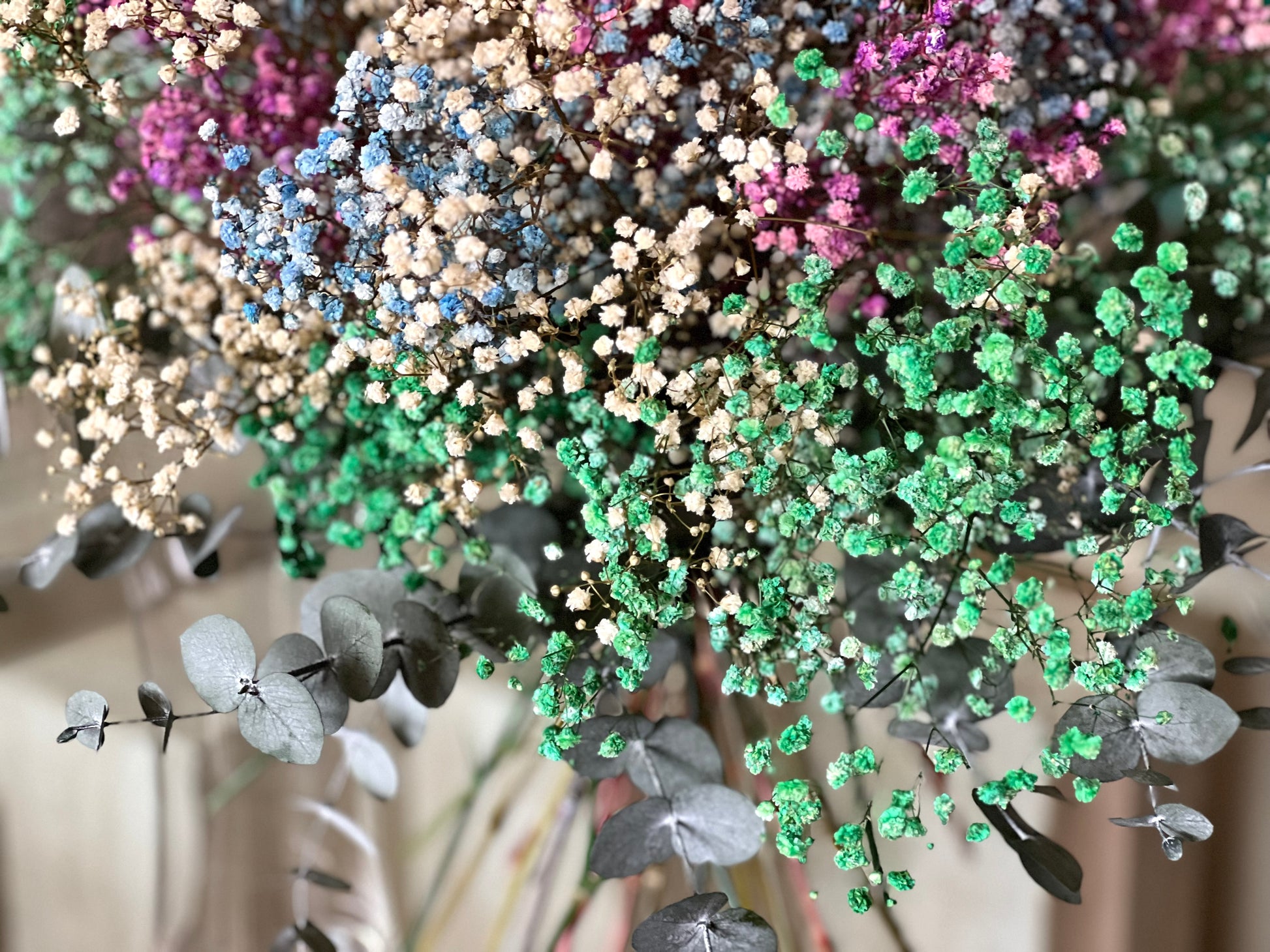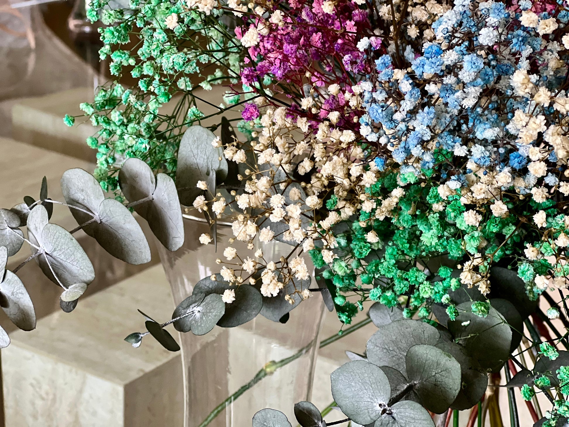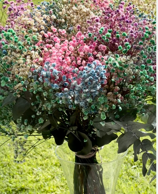 Flores que incluye: Paniculata de distintos colores y eucalipto. Todo preservado.