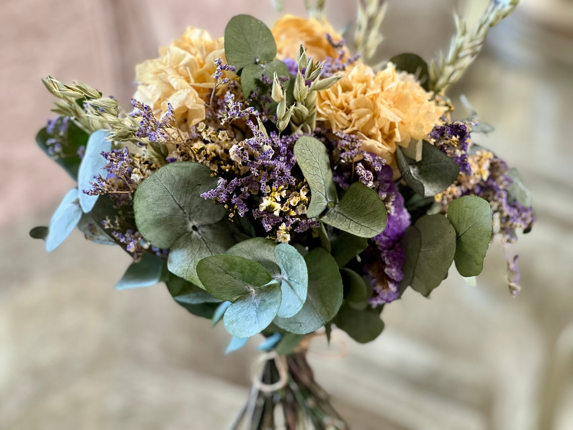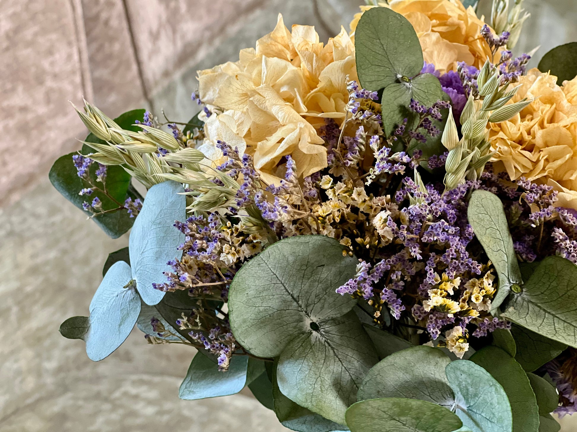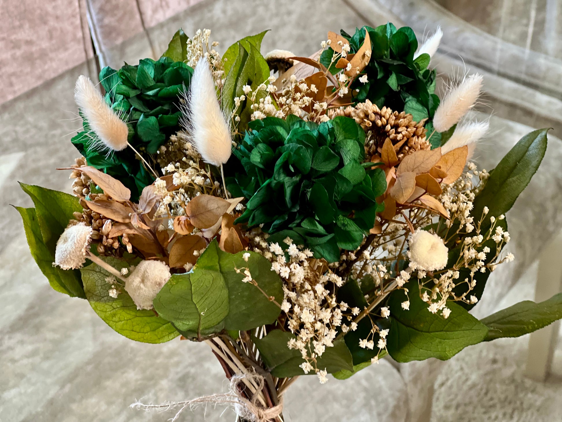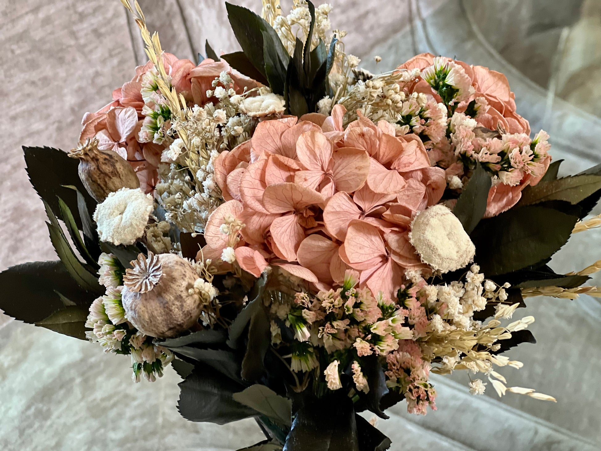 Flores que incluye: Capullos de hortensias en el color elegido. Verdes como lentisco, salal o eucaliptos u otros verdes preservadas y otras flores de acompañamiento secas o preservadas.